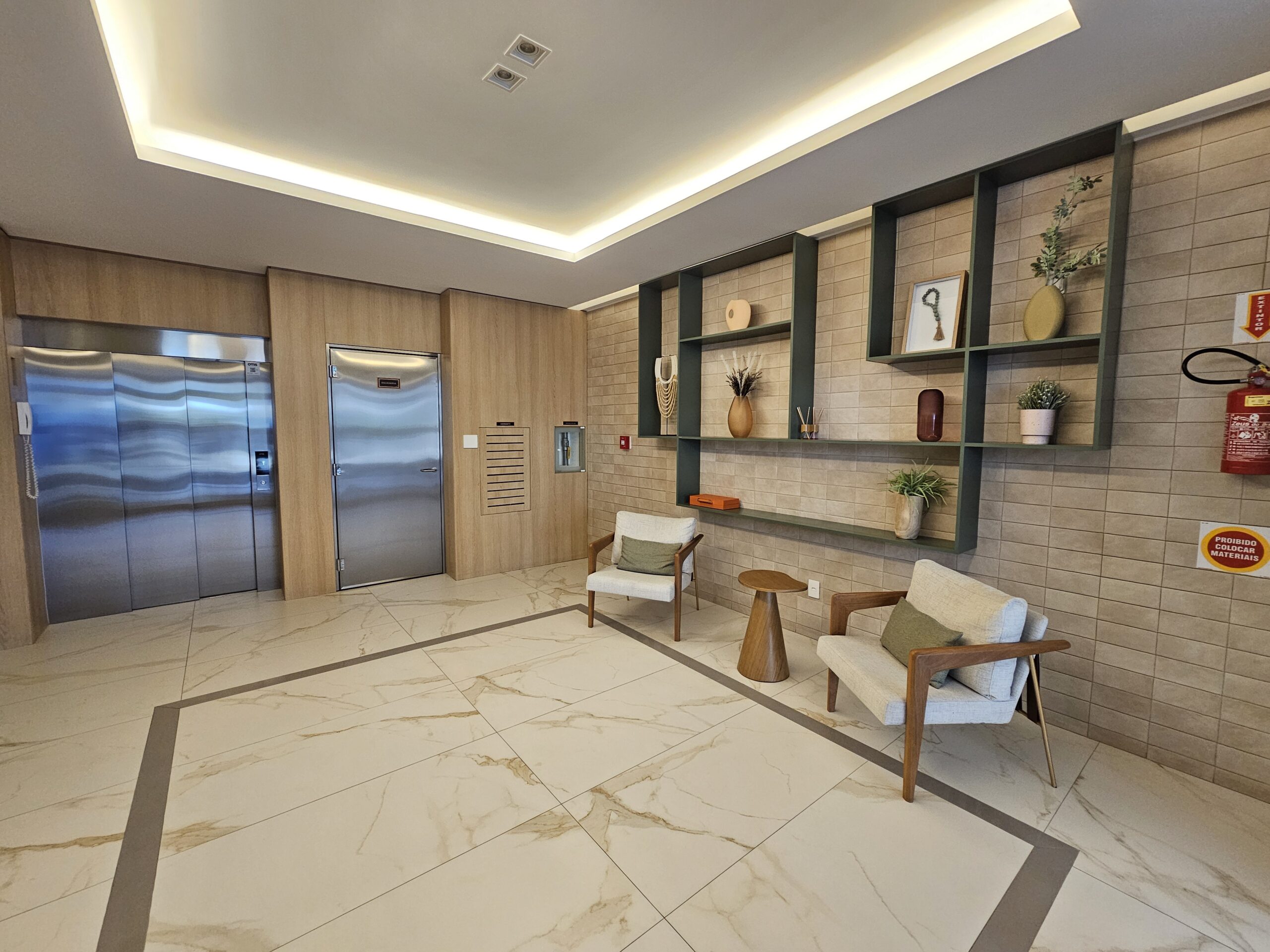 - Hall de entrada decorado e mobiliado, transmitindo um estilo acolhedor desde o primeiro contato com o edifício.