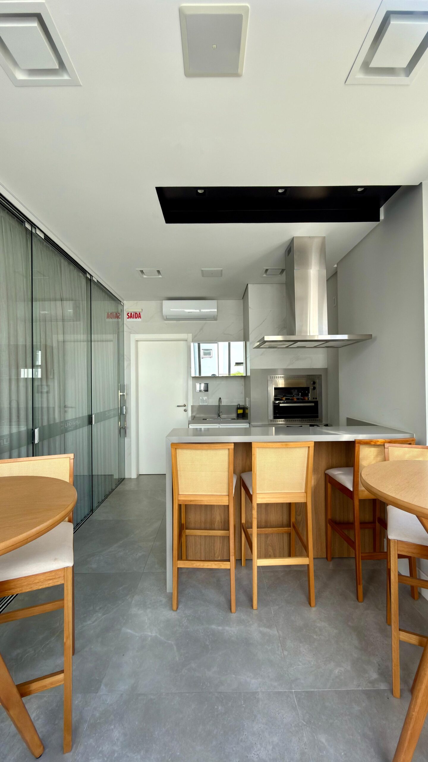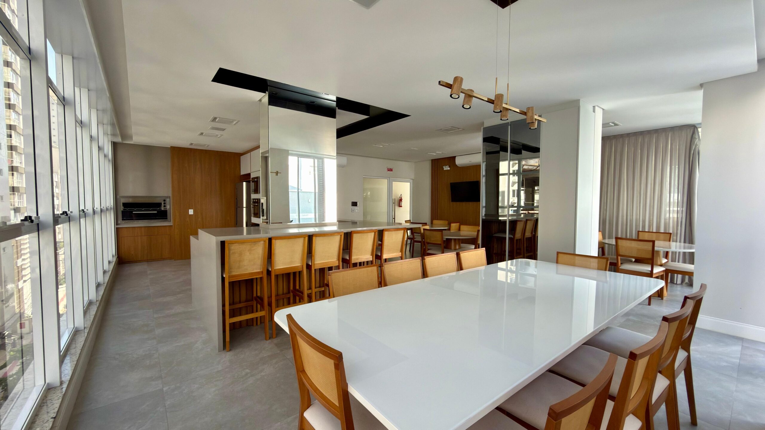 Espaço gourmet e salão de festas decorado.